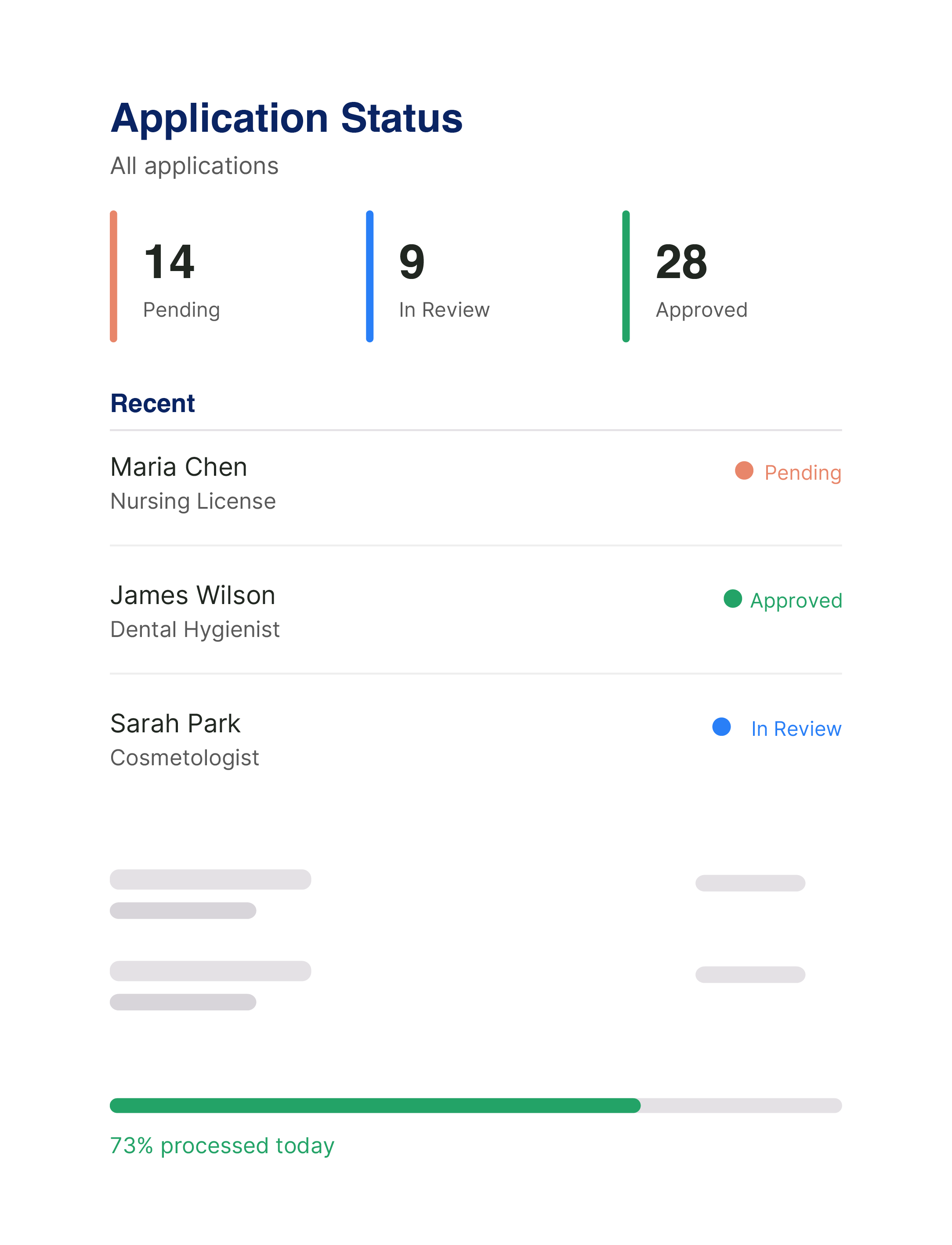 Applicants log in to see their application status, next steps, and required documents. They know what's pending and what's complete so they don’t have to call you.