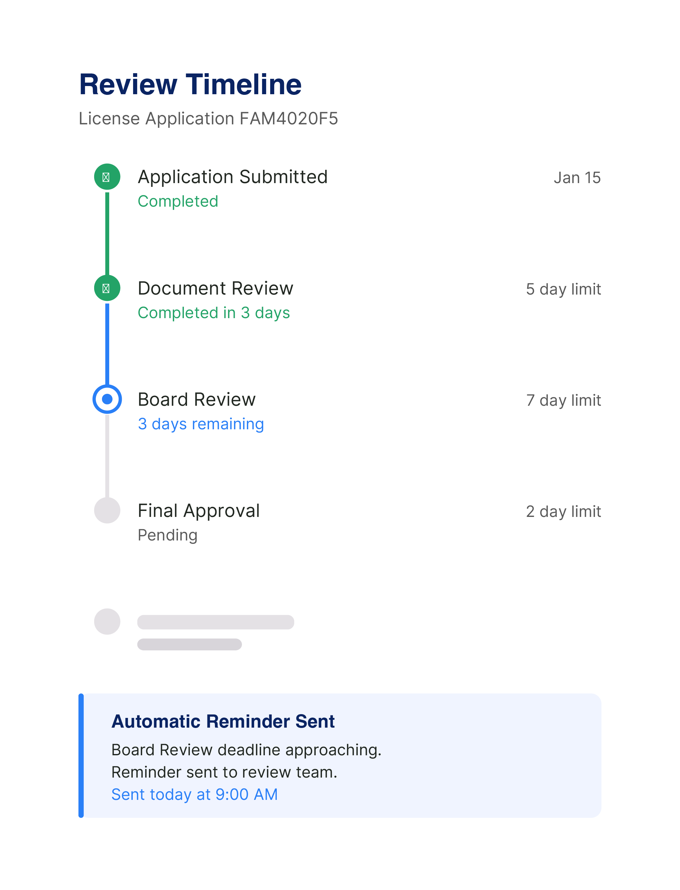 Every status transition on every license is documented, timestamped, and immutable, creating a defensible record for appeals and public records requests.