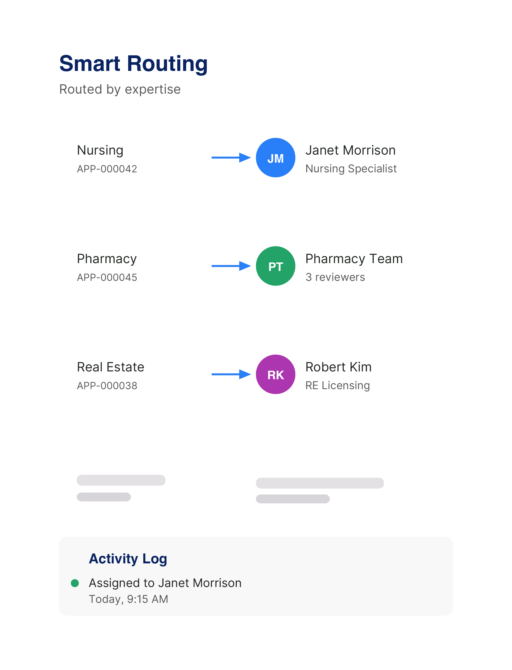 Your team controls licensing workflow configuration from day one. Build license cycles,application routing, and approval chains without submitting a change request.