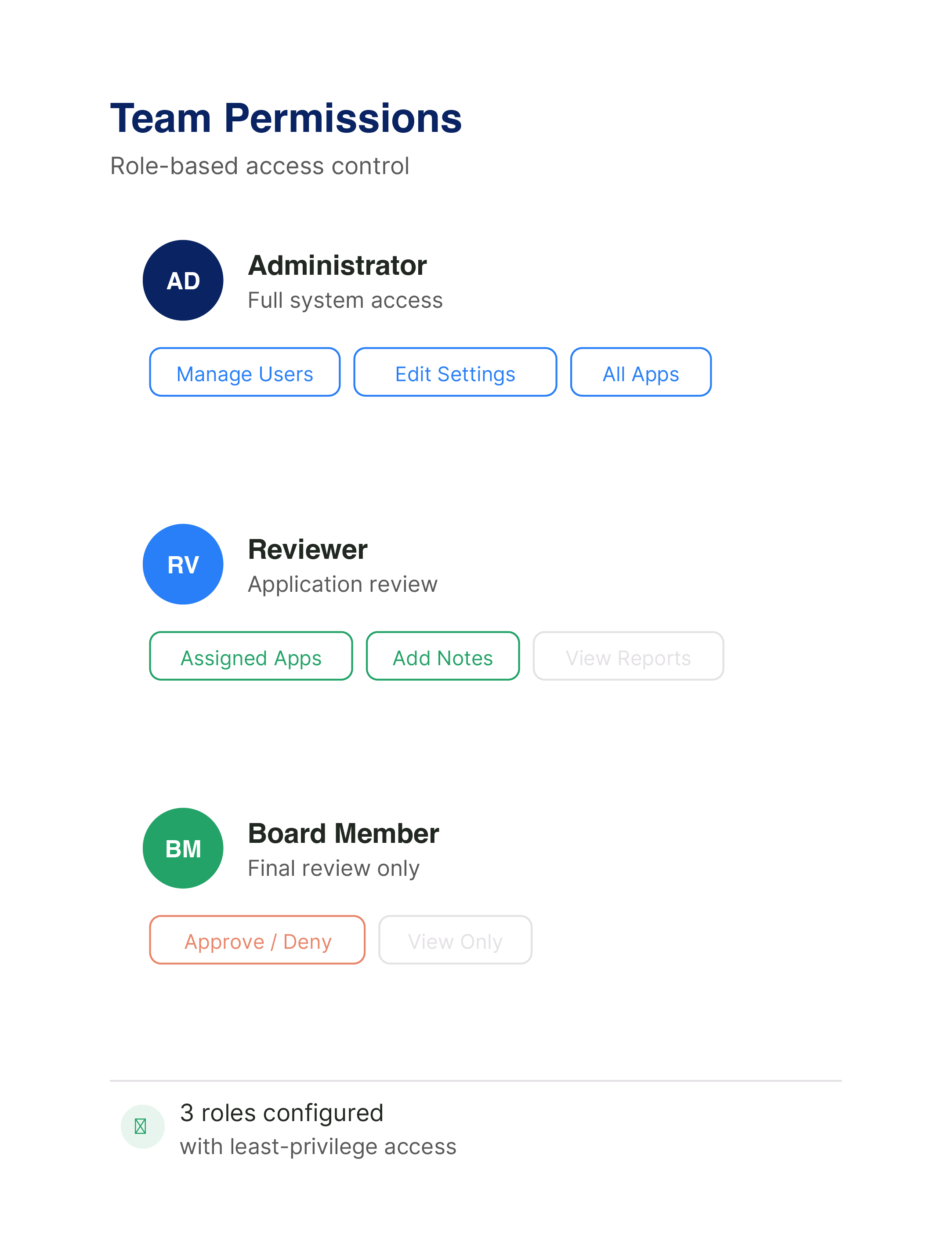 Role-based access controls that match your agency's structure. Board members see what they need for decisions. Investigators access case files. Staff handles day-to-day processing. Nobody sees more than their role requires