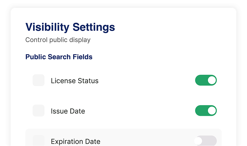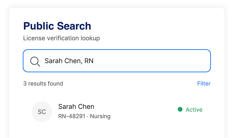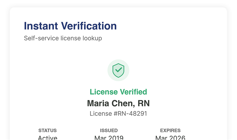 Your directory works the way you need it to. Employers check credentials in seconds. The public can request an official license verification (with a fee). You decide what stays visible and what stays private.
